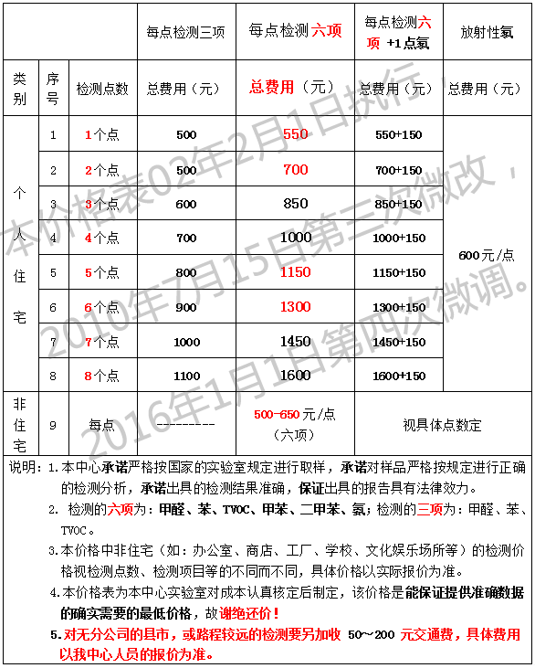 7.㈢、对无分公司的县市上门检测一律另加收 100~300 元交通费,具体费用视情形而定。 7.㈣、办公室、商店、工厂、学校、文化娱乐场所等的检测价格视检测点数、检测项目等的不同而不同,具体价格需视现场实际情形而定。 7.㈤、我中心人员上门采完样,签好合同后,我们收取全部检测费用,以利我们第3天告知检测结果。 7.㈥、特别提醒:由于进行空气检测采样用的吸收液均要求当天在实验室现配,该吸收液隔夜即失效(不允许再使用),为加强成本控制,本实验室每天一律不多配该吸收液,故当我们采样人员上门后您不能再要求增加采样点数,对要求减少采样点数的客户,一律加收样品损失费,1个采样点的吸收液加收50元整损失费;例如:你和我中心确定好做4个点(5项指标,共1300元),现场你改做3个点(5项指标),你应付1000+50=1050元。 7.㈦、对单位三废、单位废水、单位废气、单位噪声、单位环境检测等,麻烦你把贵单位的①单位名称、②单位地址(如果检测地址和单位地址不同,麻烦也写上检测地址)、③联系人及联系人的联系电话,最好写上联系人的手机号码、④要检测的项目(尽量详细)等发到我中心检测业务邮箱:jshjjc@163.com,我们收到邮件后会给你报价;当然你发完邮件后最好再打给电话告诉我一下,谢谢理解! ■ 8. 封闭过程及检测过程中不准开空调和换气扇(中央空调和客户特别要求除外,但必须记录在案)。 ■ 9. 封闭过程和检测过程中不要进行影响测试结果的活动,如吸烟和用燃气灶等。 ■ 10. 检测现场需清理干净,不能堆放残余的涂料、油漆、板材等。 ■ 11. 封闭过程和检测过程中不要使用化工产品,如空气清新剂,香水等等。 ■ 12. 检测过程中每个房间的门尽量相互关闭,不要保持通风。 ■ 13. 人员进行室内环境检测前,您应要求检测人员出示相应的职业资格证书,并核实该证书上的照片是否为其本人,否则您可以拒绝该检测人员进行检测。 ■ 14. 检测过程中检测人员和其他人员共计人数最好不得超过 3人,尽量减少人员活动对检测的影响。 ■ 15. 上门进行空气采样耗时:每个检测点采样耗时约 25分钟, 3个检测点采样耗时约 75分钟, 4个检测点耗时约 100分钟。 ■ 16. 出具报告时间:自取样之日始,第 5个工作日左右提供 CMA报告,如客户确有需要,可提前约一天电话告知检测结果。 ■ 17. 根据检验报告结果,本公司针对每户的实际情况有针对性的出具一份室内环境污染评价建议。 ■ 18.友情提醒:由于现在市场上喷洒化学药剂的治理办法没有任何国际标准或行业标准,对治理用的药剂是什么成分无法知道,对药剂本身是否有污染无法确定,对治理后是否产生新的污染物(该新的污染物可能现在我们还没有发现,或该污染物现人们知道但不知道是哪种)也无法知晓,故现在我们不推荐进行使用化学药剂的任何治理方法。不能进行化学治理的原因,详:点击进入 >> |